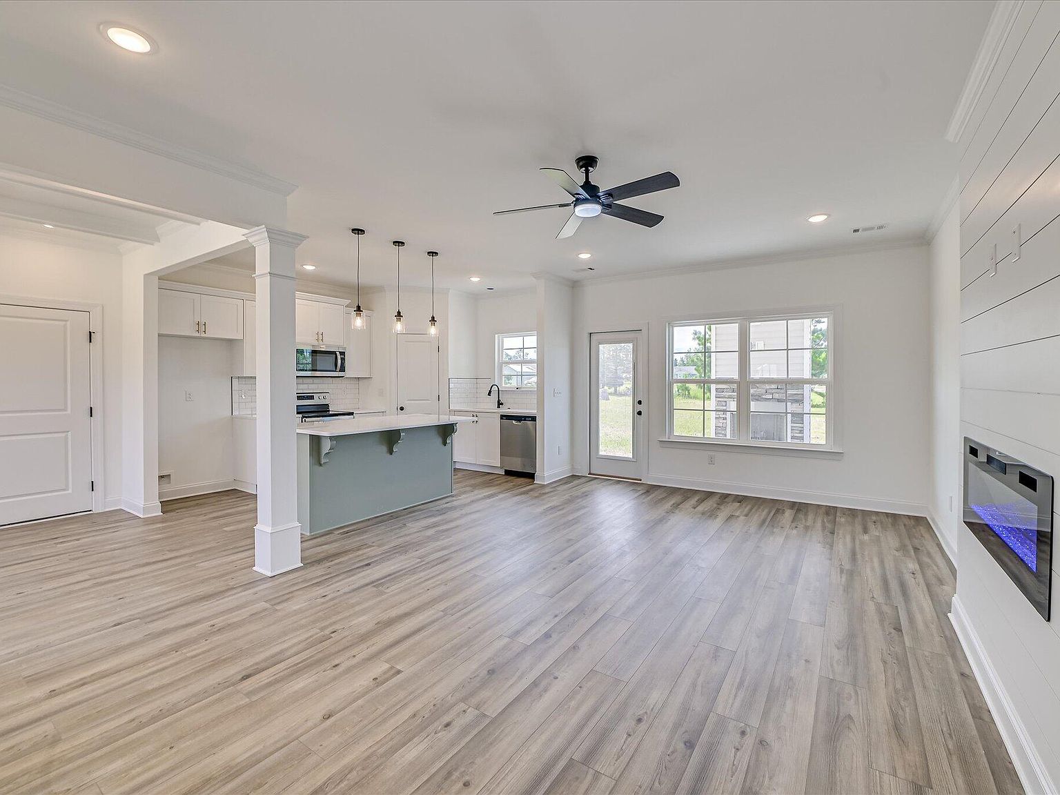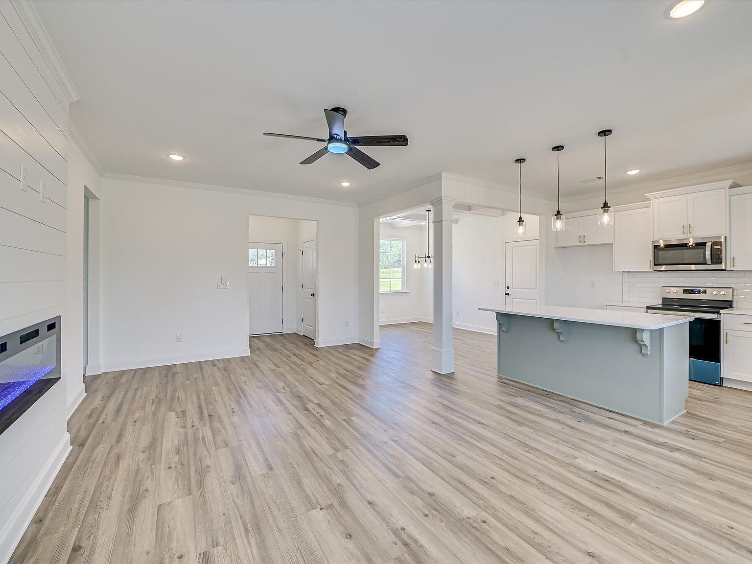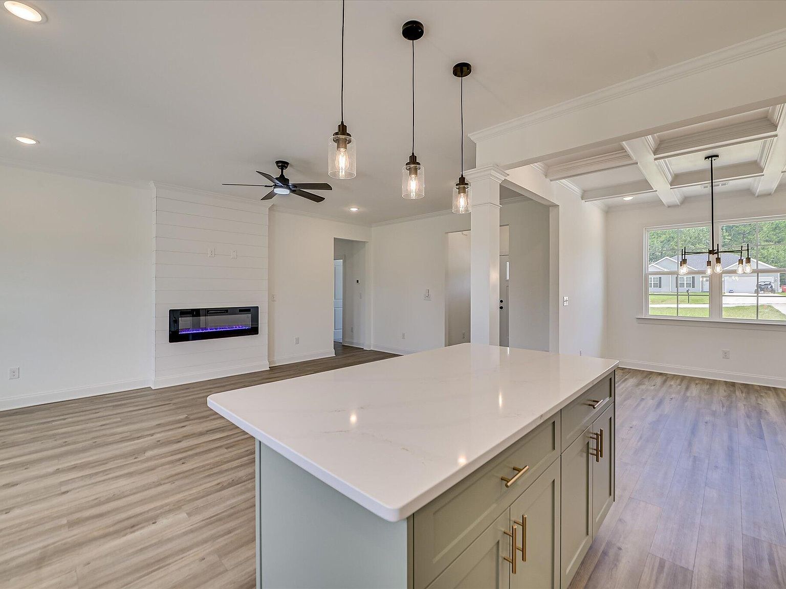 - Open-plan great room (21×13) anchored by a built-in electric fireplace, seamlessly flowing into a gourmet kitchen and casual dining area.