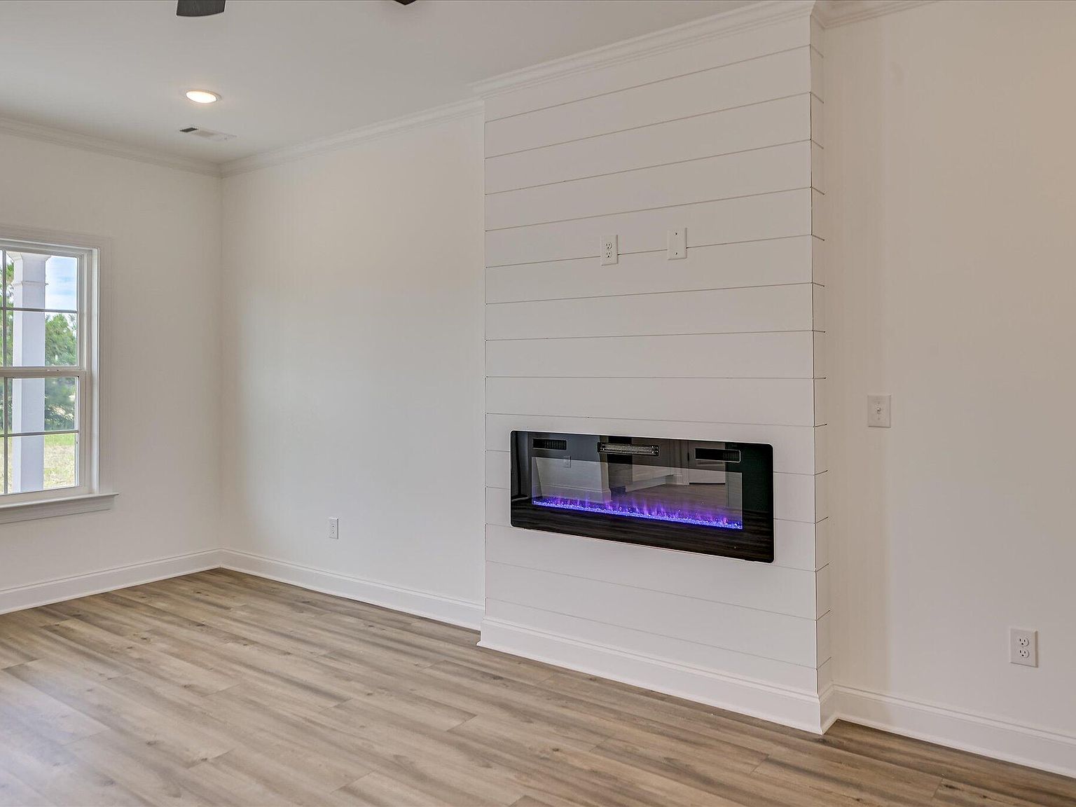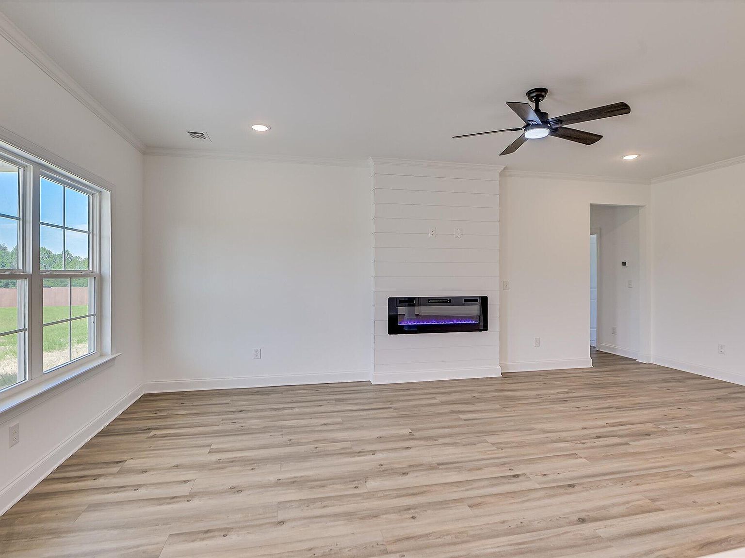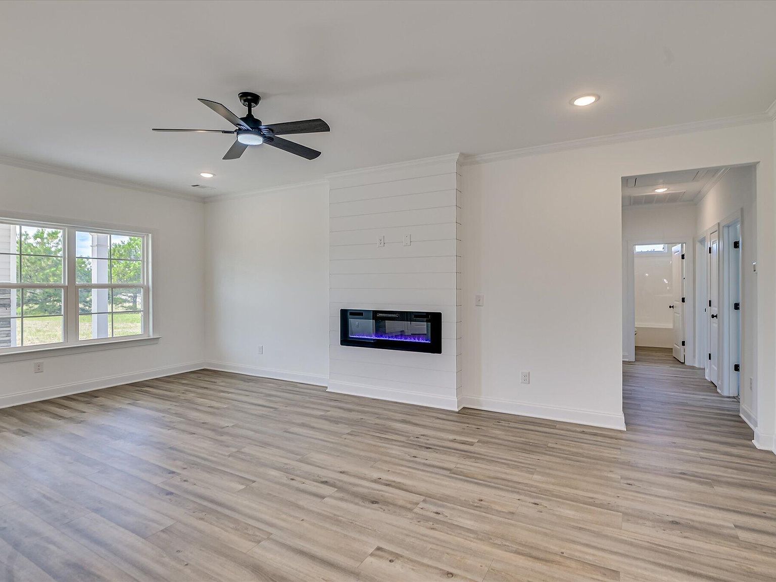 - Open-plan great room (21×13) anchored by a built-in electric fireplace, seamlessly flowing into a gourmet kitchen and casual dining area.