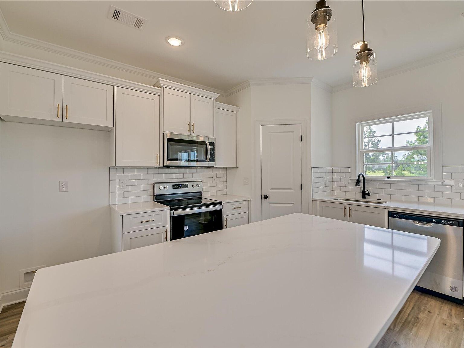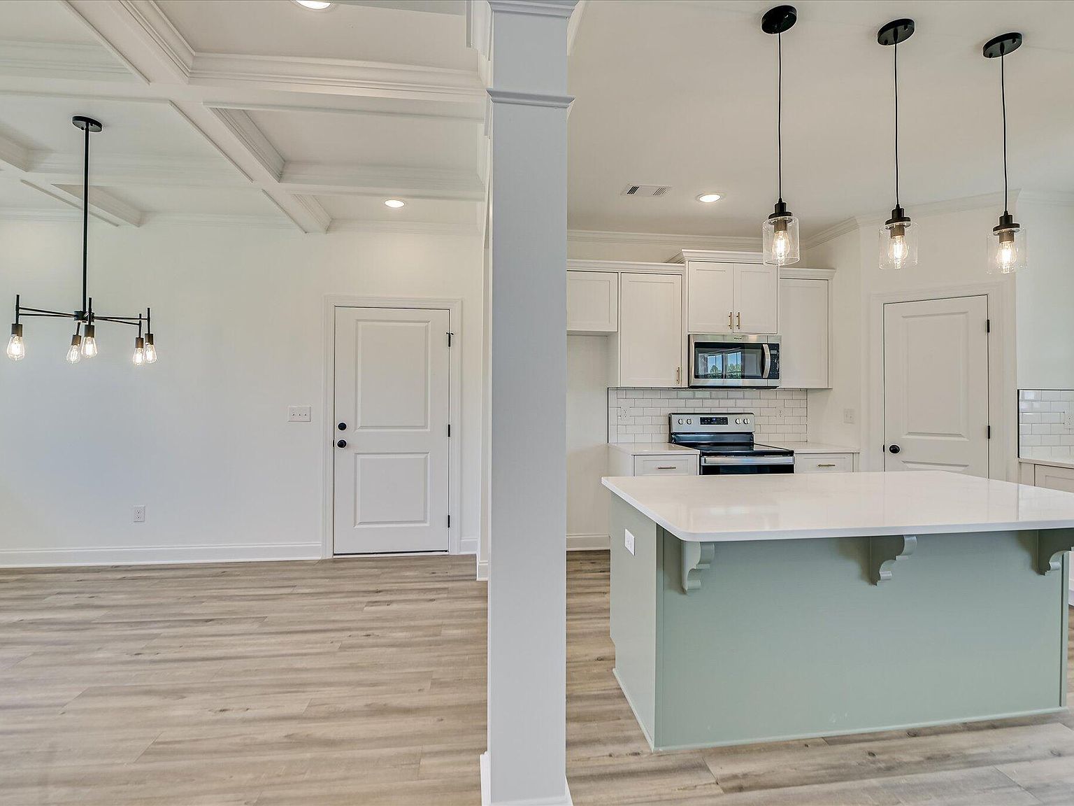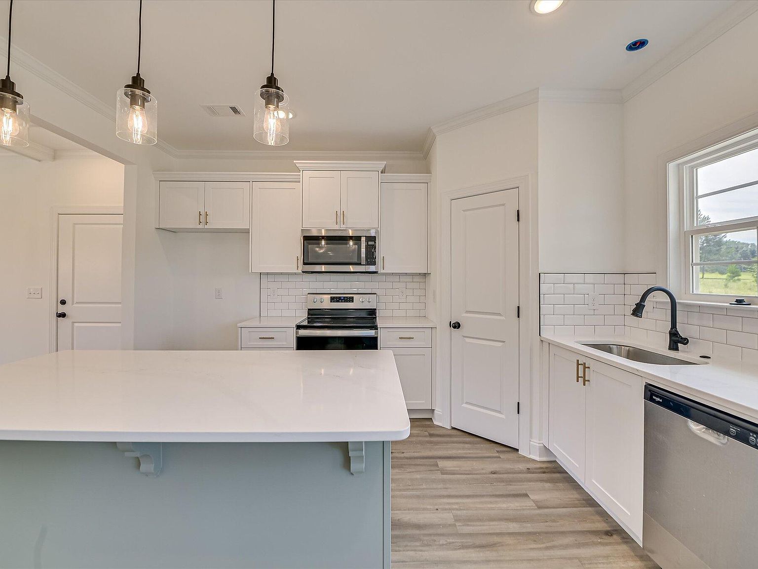 - The kitchen includes a large island, stainless steel appliances, a pantry, and luxury vinyl and hardwood flooring throughout the main living areas.