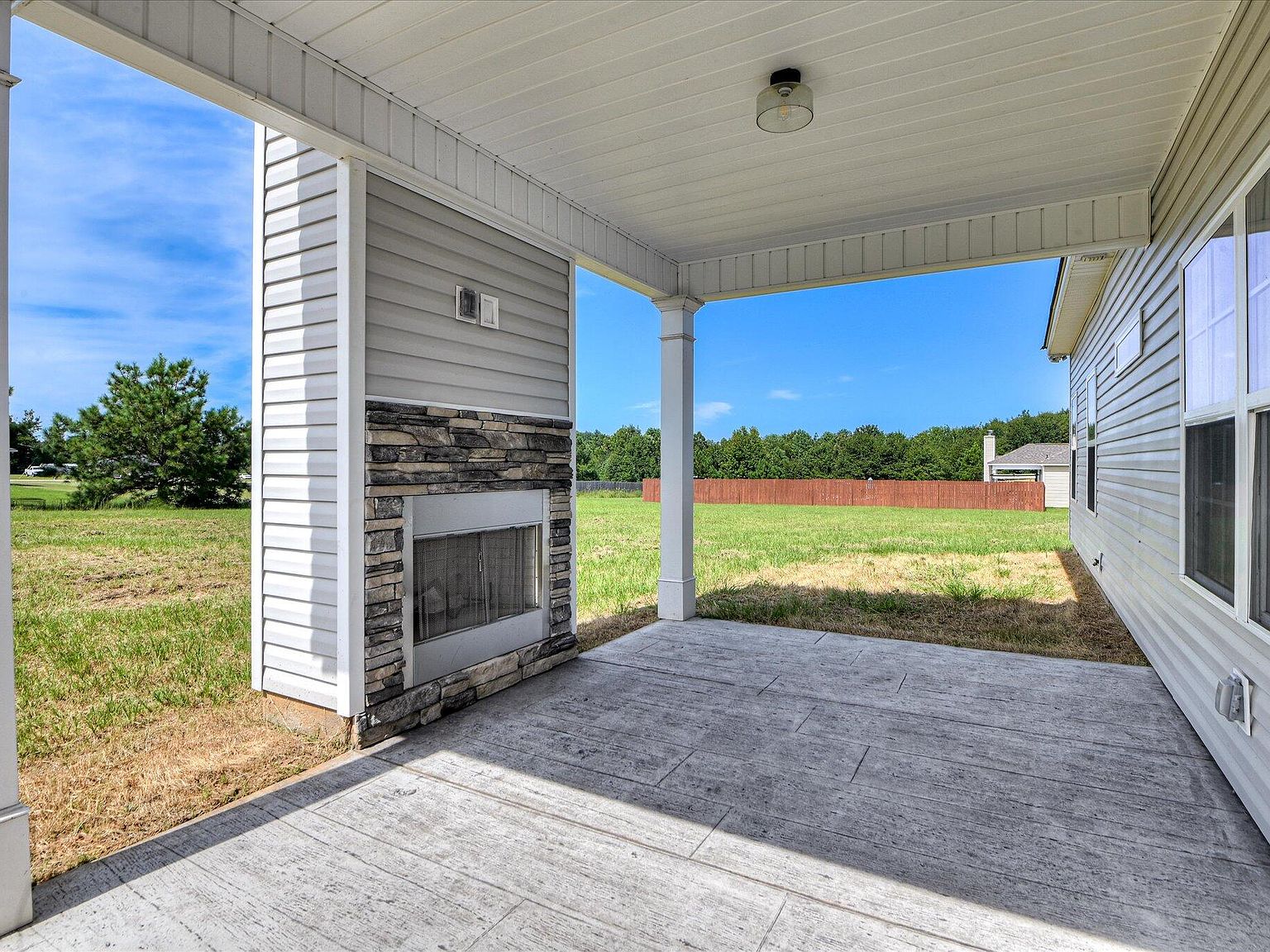 - Outdoors, a stamped-concrete covered patio with a custom fireplace delivers a high-end entertainment space in a private backyard setting.