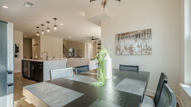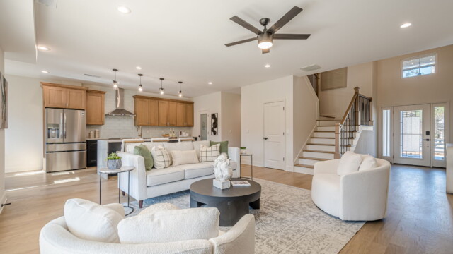 - Dramatic open concept with towering ceilings and seamless flow from main living to kitchen.